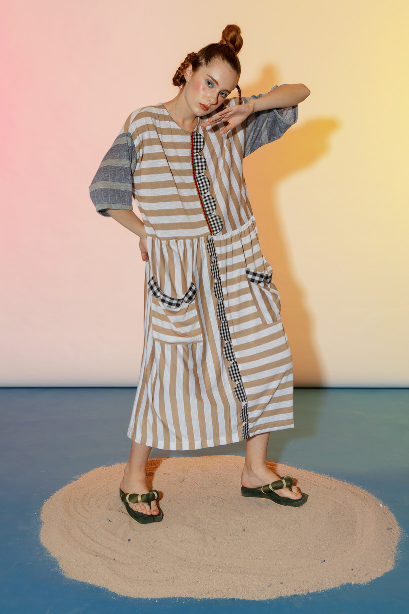 CORAL DRESS CREAM STRIPESThe adorable scalloped jersey sun dress is printed with neutral colored str.....