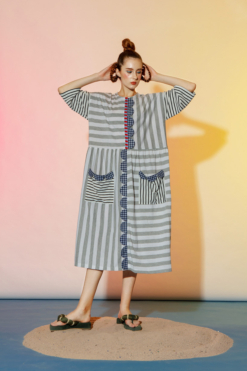 CORAL DRESS GREY STRIPESThe adorable scalloped jersey sun dress is printed with white-grey stripes a.....