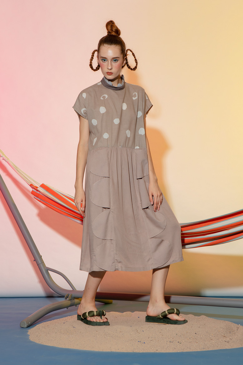 ARIEL DRESS BEIGEAriel dress is your one of a kind look, with high collar trimmed with hand sewn sca.....