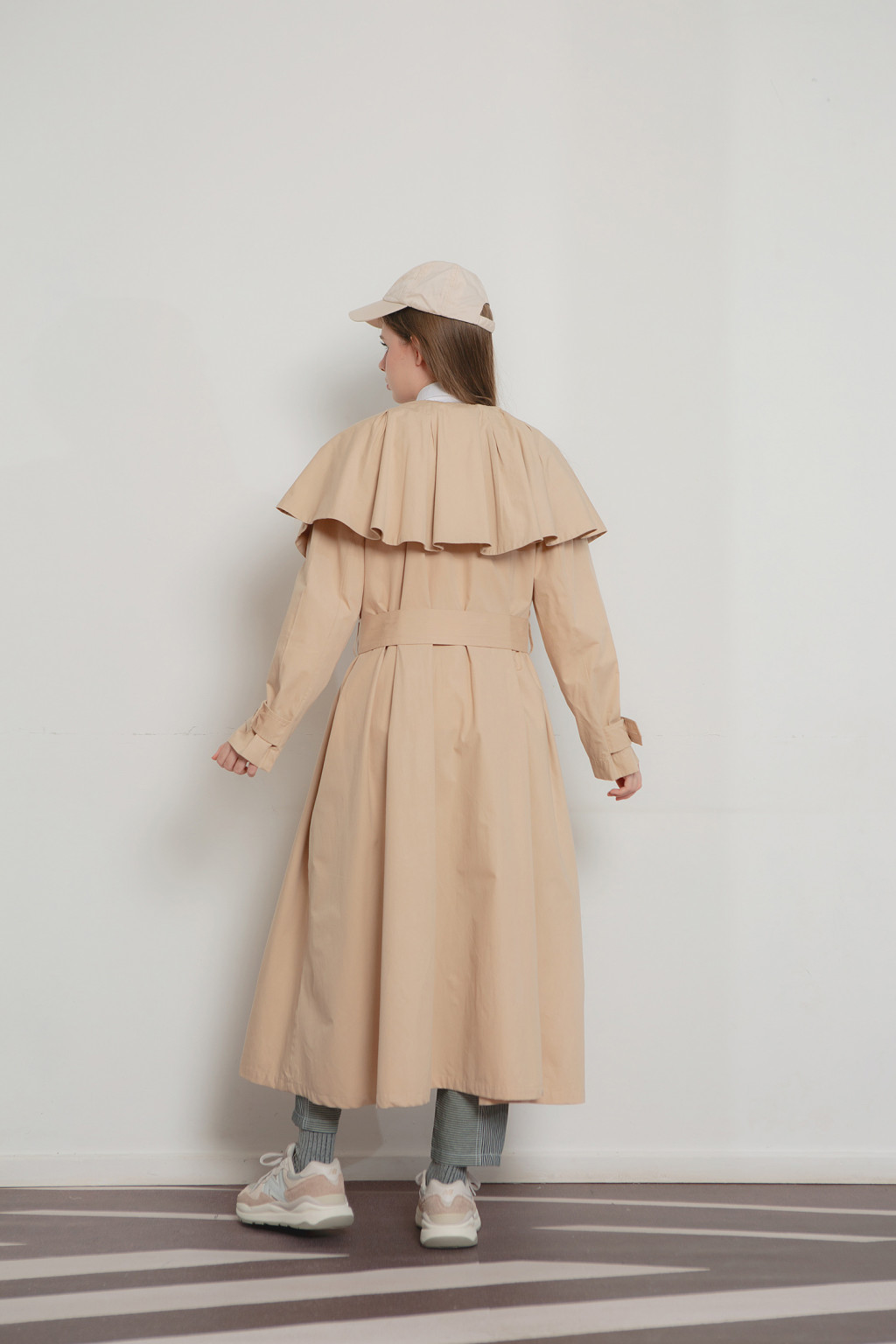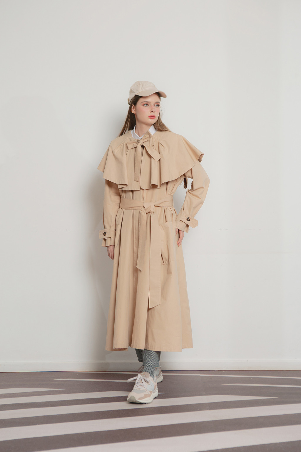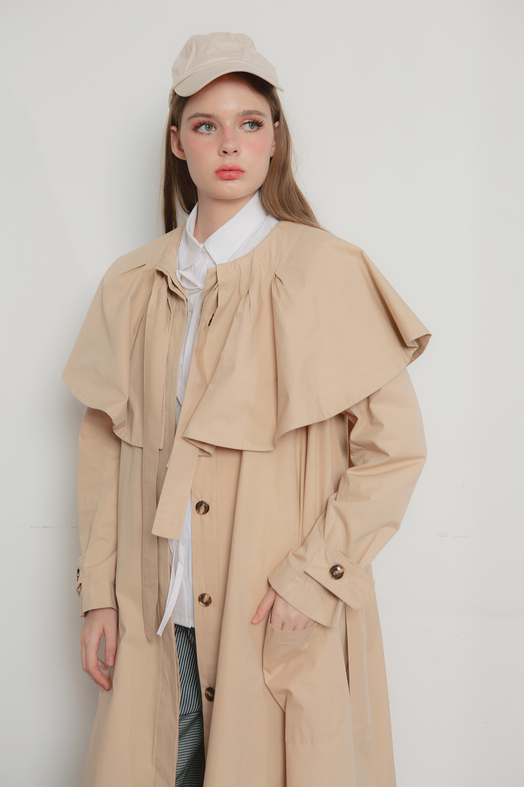 Nora flare coat is cut in cotton fabric, adorned with cape collar and detachable neck ribbon it can be further accentuated with the detachable belt to cinch your waist. Nora has two front pockets and two side pockets. Wear Nora with white shirt, denim and sneakers to keep it chic.