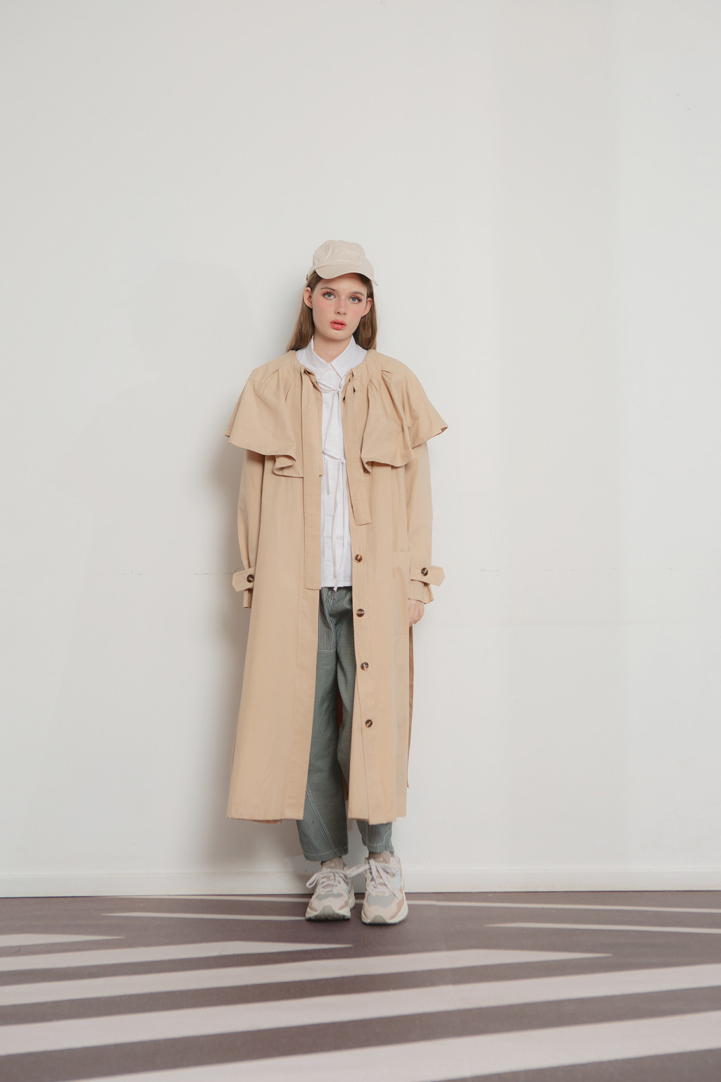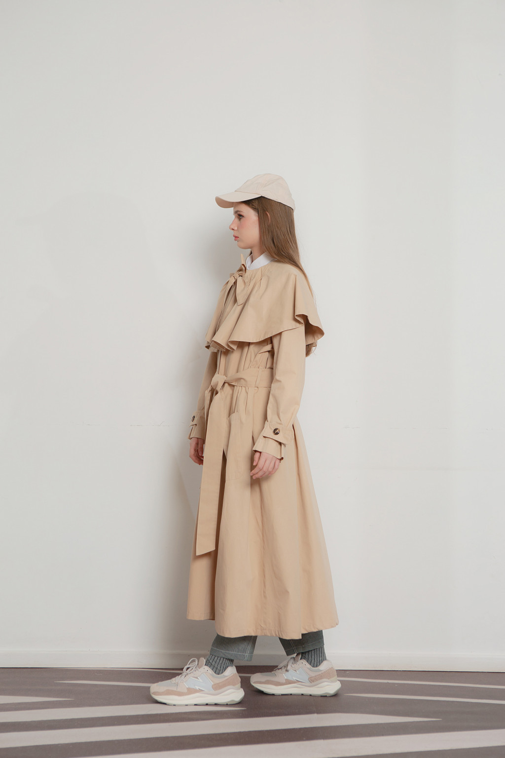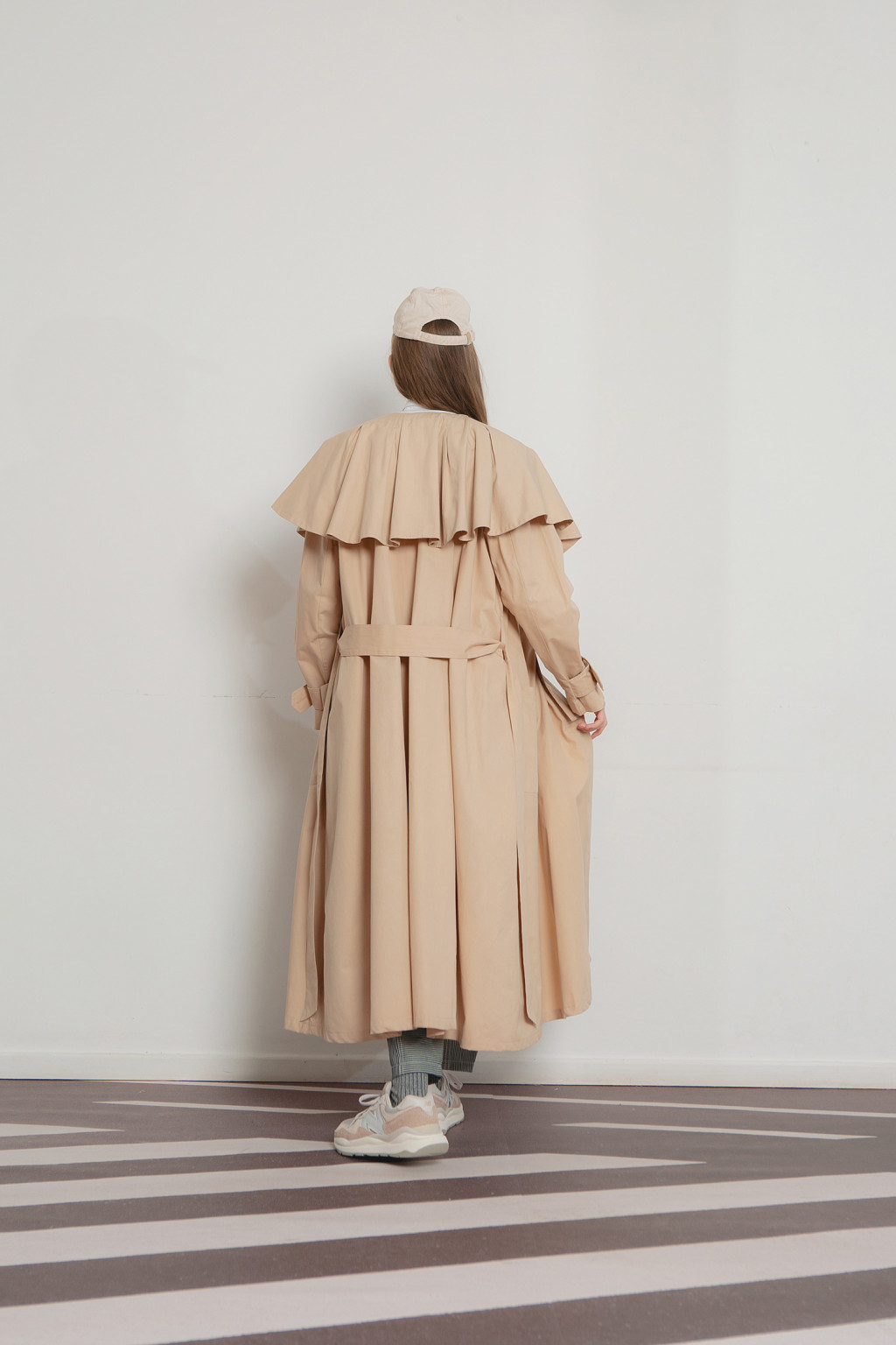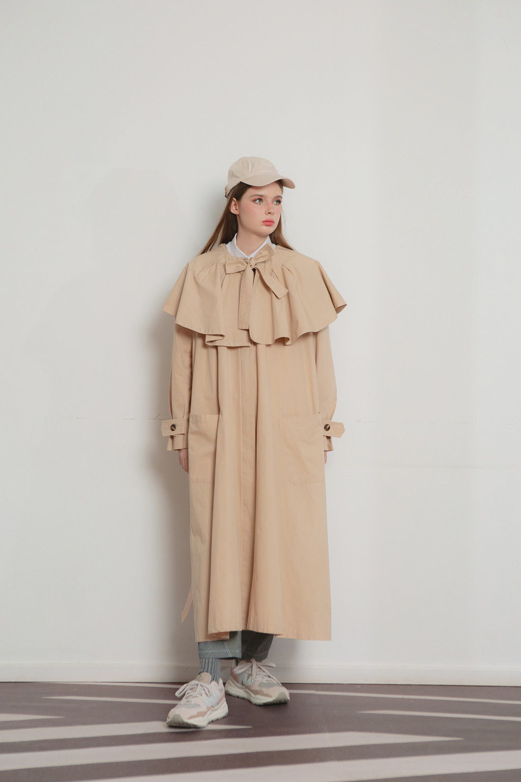 Nora flare coat is cut in cotton fabric, adorned with cape collar and detachable neck ribbon it can be further accentuated with the detachable belt to cinch your waist. Nora has two front pockets and two side pockets. Wear Nora with white shirt, denim and sneakers to keep it chic.
