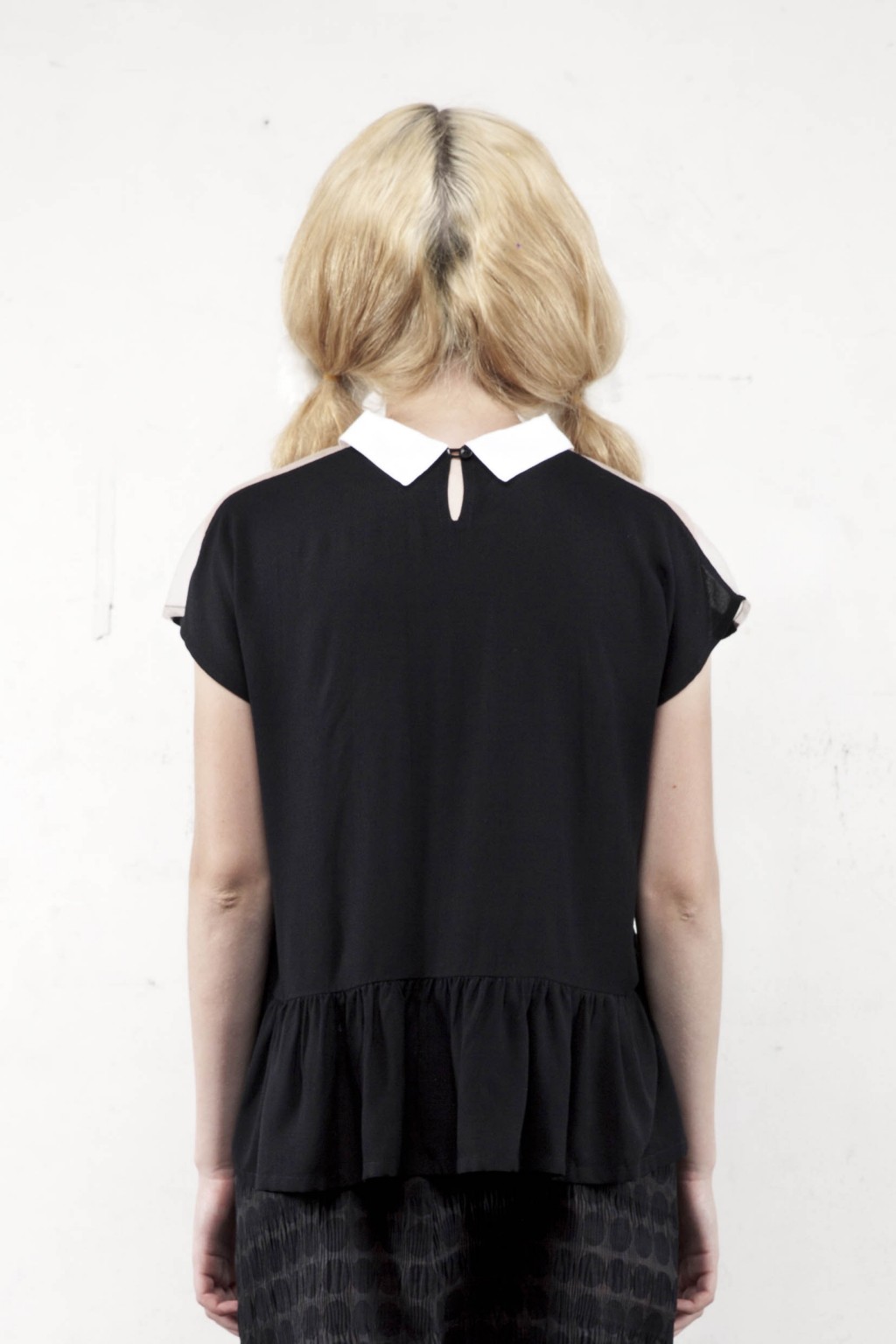 Love top has a sweetheart neckline made of tulle in nude. White peter pan collar and loose bodice. Finished with small peplum at the waist. Absolute quirk and sweet. Complete the look with our wide leg black Finn pants or Momo pants.