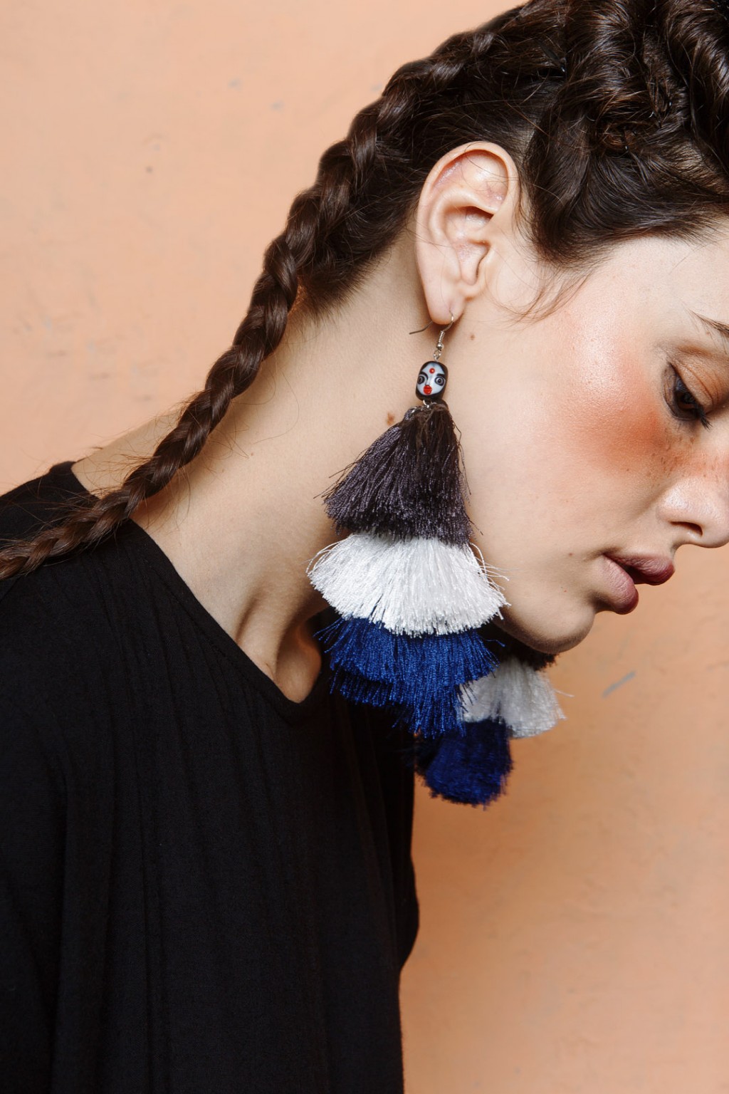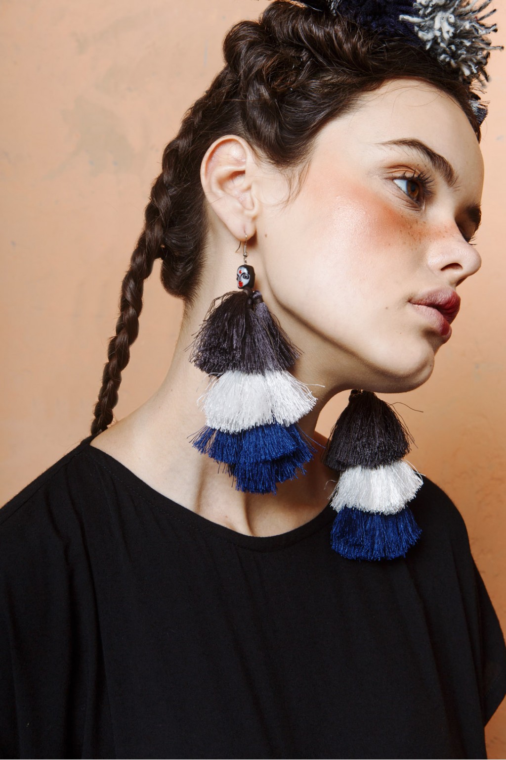 Tabby earrings were the accessory of choice at Monday to Sunday SS18 JFW Runway show, embellished with a traditional mask-face in glass beads, three tier-multicolored full-row of tassels and hook metal earrings, it portrays culture and heritage of Indonesia.