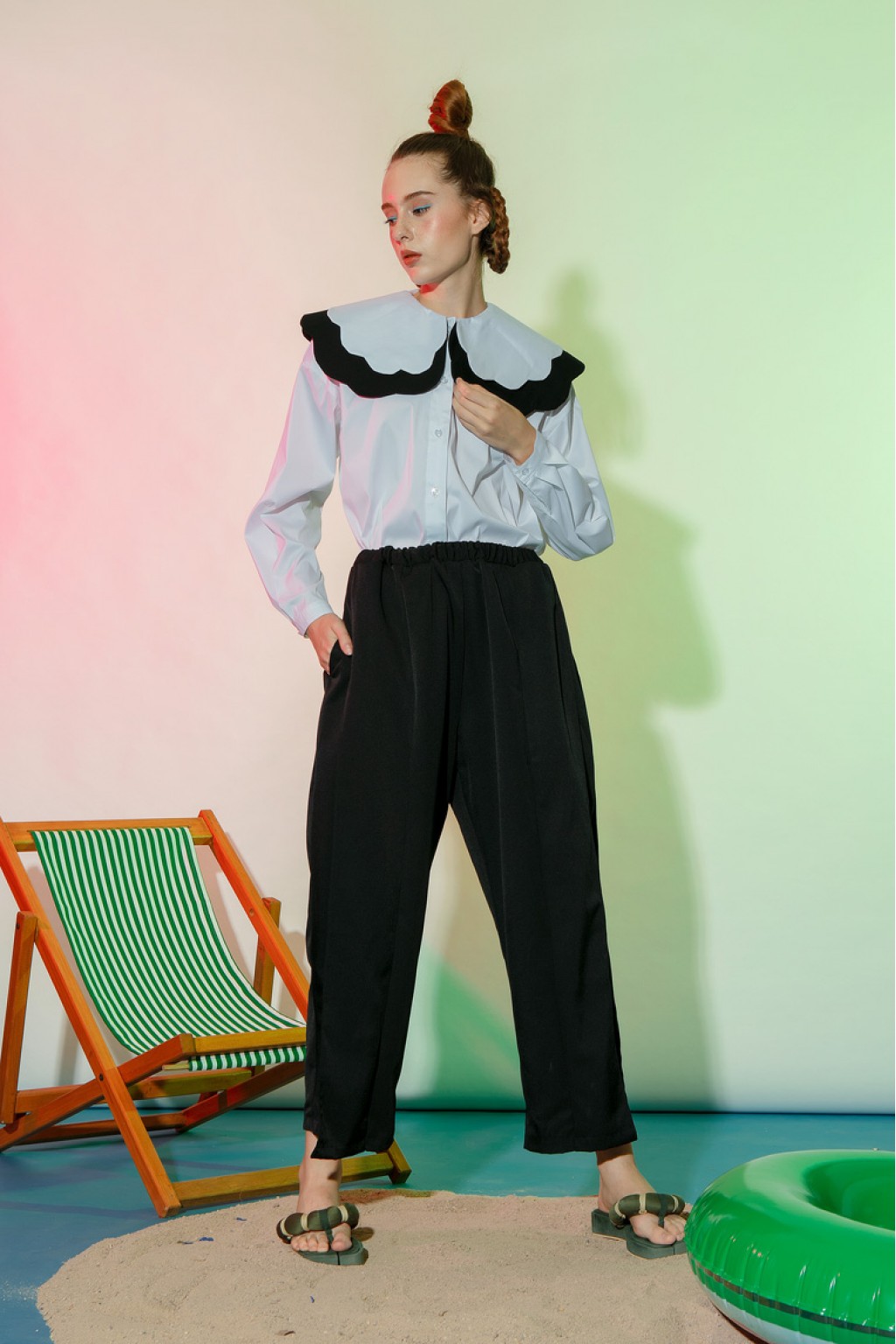Made from cotton with straight-fit cut, Maris pants is paneled with front middle layer in each side, equipped with two side front pockets and stretchable waistband for comfort. Match Maris pants with Mira top and clutch for a glam-night look.